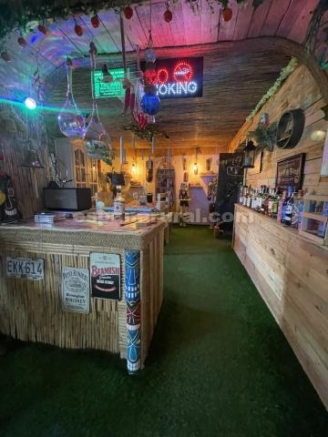 Tiki bar area with bar counter, seating, and dining space.